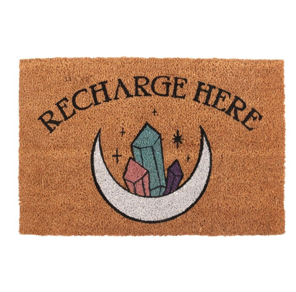 Remind guests that your home is a safe space for all with this trendy doormat. Features 'Recharge Here' text accented by crystals and a mystical moon. Design may fade in extreme weather. Suggested for sheltered and indoor use only.