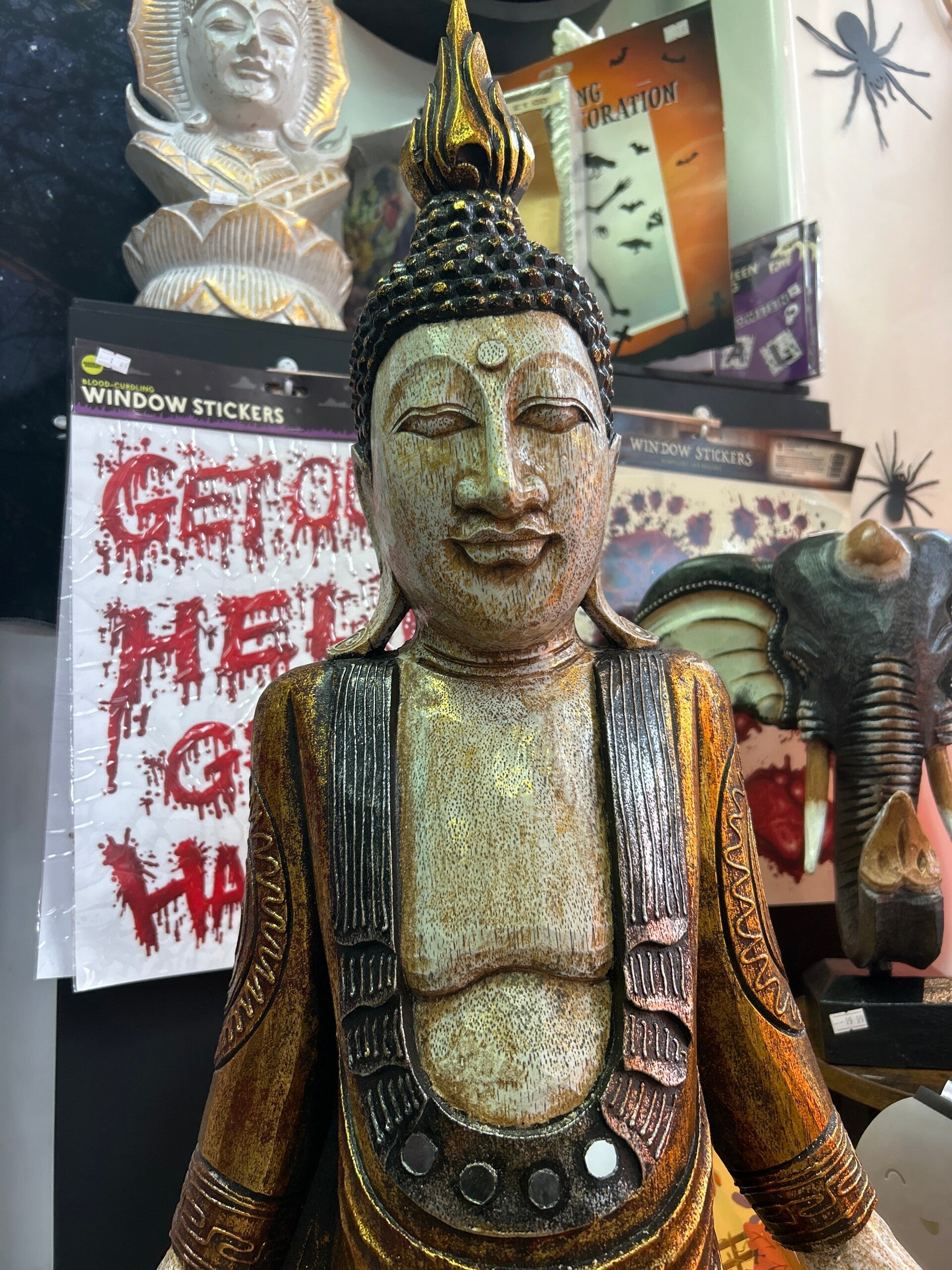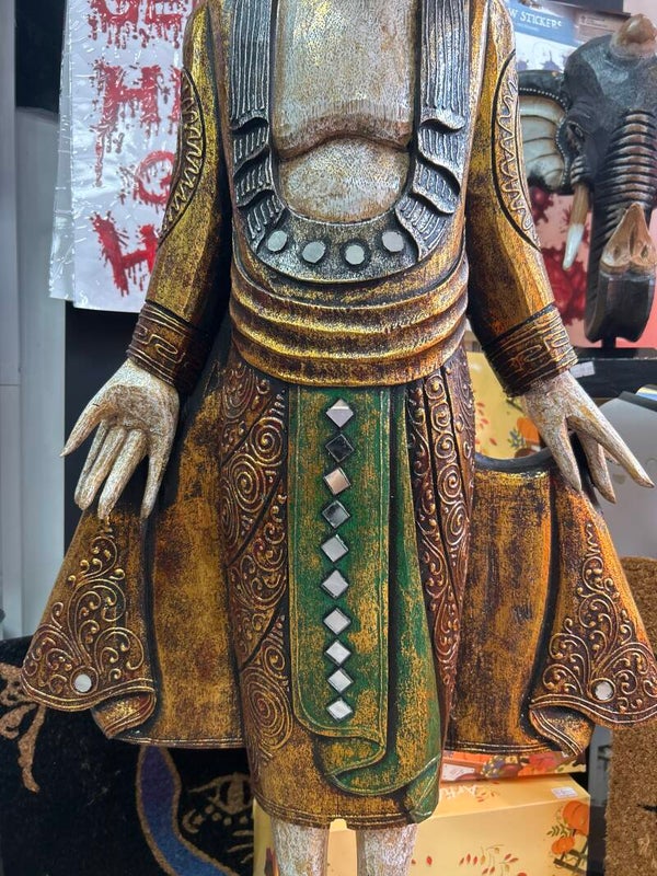 This standing buddha ornament is handcarved in Bali from albasia wood and features intricate gold accents, H112cm x W45cm x D19cm